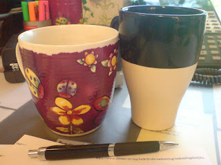 Før helgen var jeg innom en slik dillbutikk. Bare for å titte. Og fant ut at egentlig så trengte jeg vel en ny kaffekopp til å ha på jobb. Den hjelpsomme butikkdamen guidet meg kjapt til de krusene som kostet dobbelt så mye (29,50) som de jeg opprinnelig så på (15,-) - og hun fikk et salg på det også. Krusene var søte og ikke minst store. Det vises kanskje ikke så godt på dette bildet da, men min lilla kopp er mye større enn den gamle sorthvite. Den er mye større... Jeg får plass til mye kaffe i den. Så mye kaffe klarer ikke jeg drikke før den er kald har jeg i dag erfart...